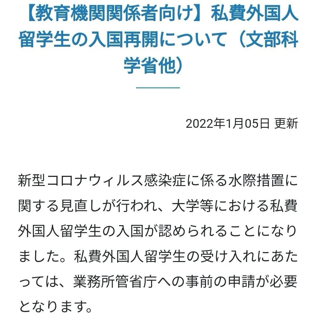 據(jù)了解,該消息1月5日就已經(jīng)下達(dá),內(nèi)容為:圍繞新冠疫情所設(shè)下的入境限制措施已經(jīng)出現(xiàn)變動(dòng),目前日本已經(jīng)允許在大學(xué)等日本國(guó)內(nèi)教育機(jī)構(gòu)就學(xué)的外國(guó)留學(xué)生入境。不過(guò),目前接收自費(fèi)留學(xué)生入境時(shí)需要提前到業(yè)務(wù)所管省廳進(jìn)行事前申請(qǐng)!
