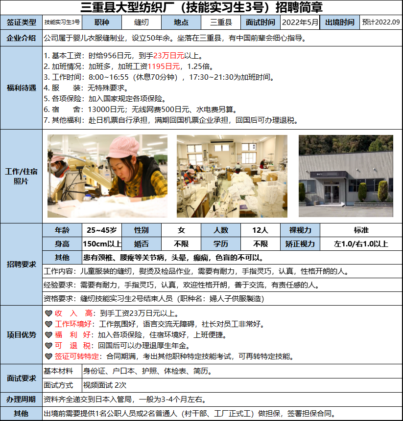 本會社工作是織布,主要負責看機器。需要性格開朗,機靈,日語學習能力強,吃苦耐勞,患有頸椎、腰疼等關節病,慢性病的不可以