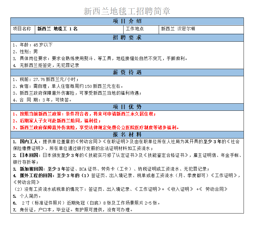 要求45歲以下,男性,會熟練完成噴涂油漆工作,日本回國的優先。稅前27.76新西蘭元/小時。
