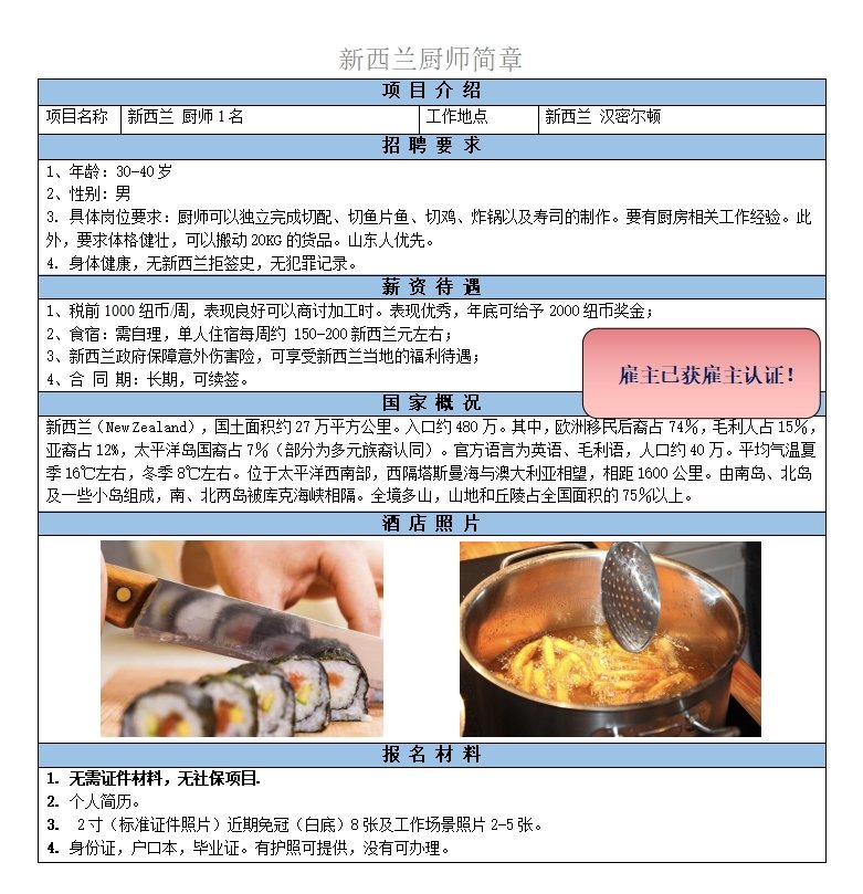 菜系不限,需要有真實的廚師經驗,切配炒鍋嫻熟。無需社保,稅后900新西蘭元/周,后期表現良好,可加薪。