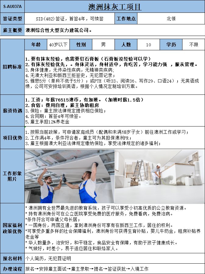噴涂工,有相關工作經驗者優先,無經驗者也可;熟練工年薪76515澳幣;雇主支付12%養老保險.