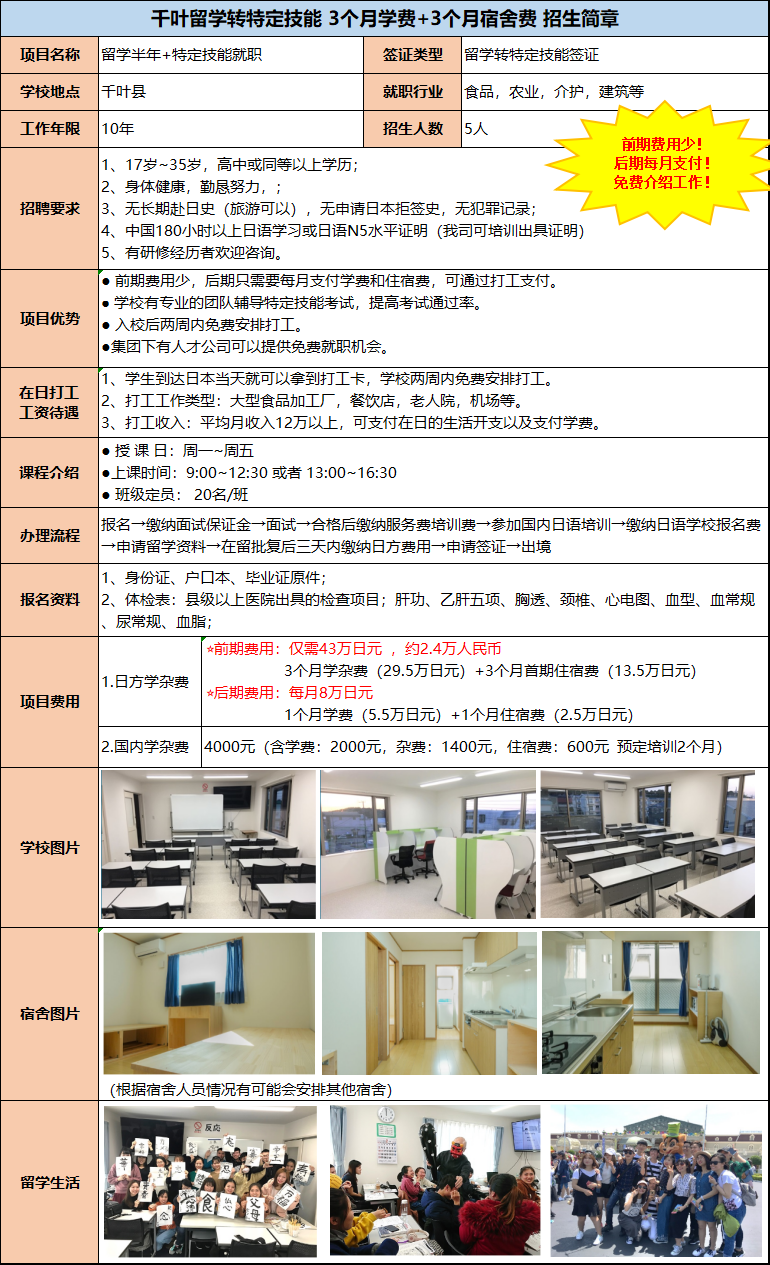 前期負擔小,留學+就業定向規劃,將來多種就業選擇;在校期間會安排日本企業面試,錄取后就可轉特定技能簽證;學校免費安排打工,個人生活開支基本可通過打工及獎學金獲得