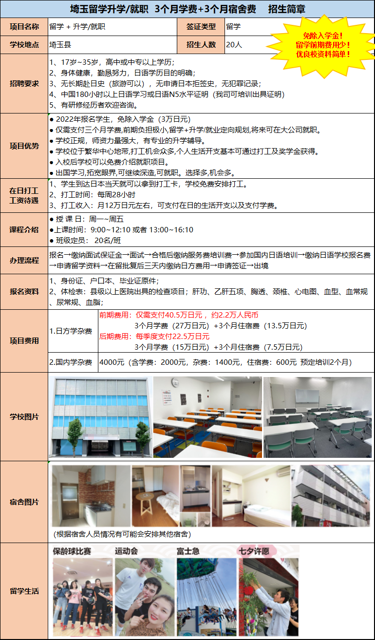 2022年報名學生,免除入學金(3萬日元),需支付三個月學費,前期負擔極小,留學+升學/就業定向規劃,將來可在大公司就職。月12萬日元左右,可支付在日的生活開支以及支付學費。