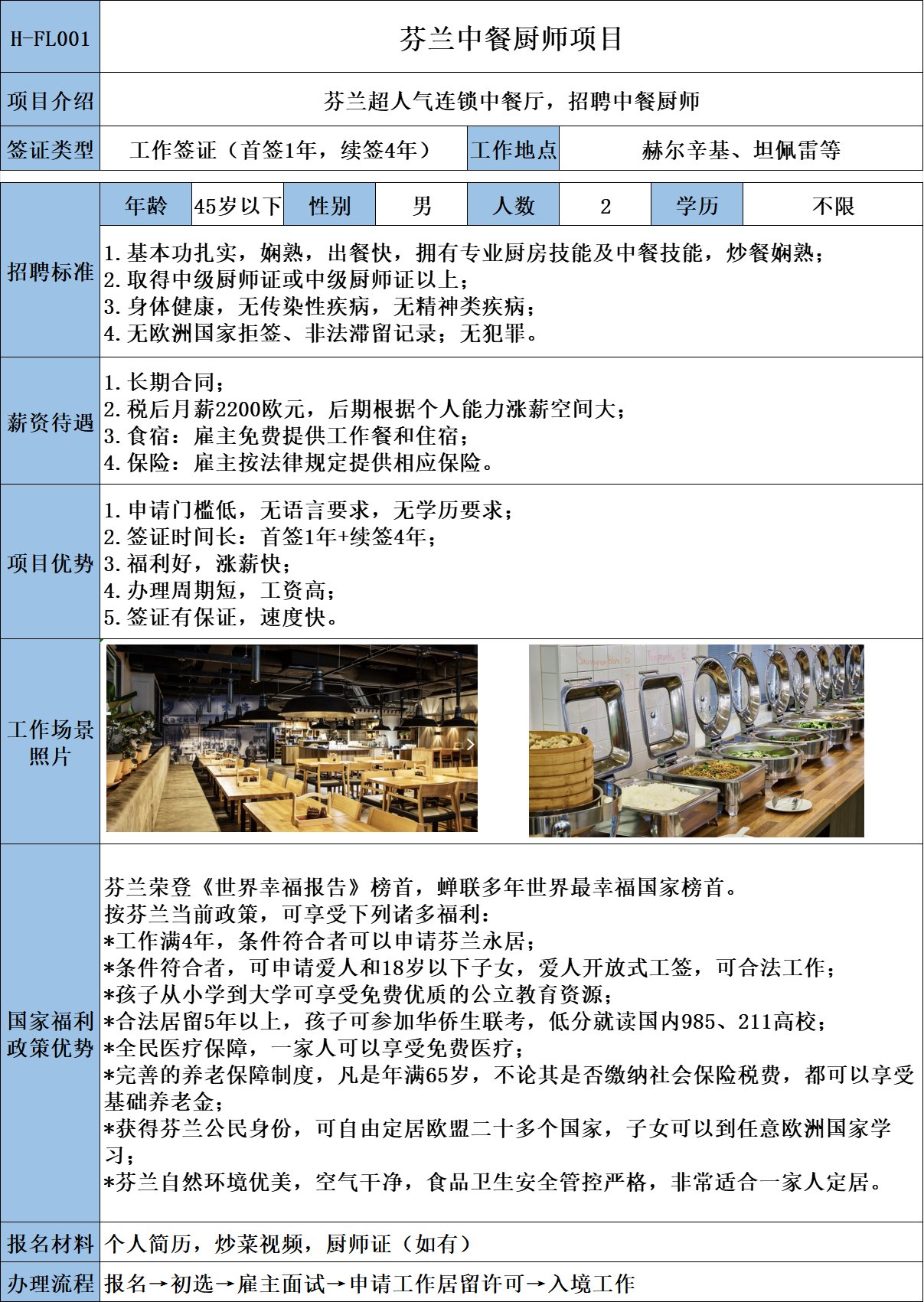 芬蘭高薪項目:包吃住,包水電,住宿地點離餐廳步行十分鐘,月薪2400歐(接近1.7w人民幣)純凈到手收入,要求40歲以下踏實樸實的師傅,不限地域不限菜系。