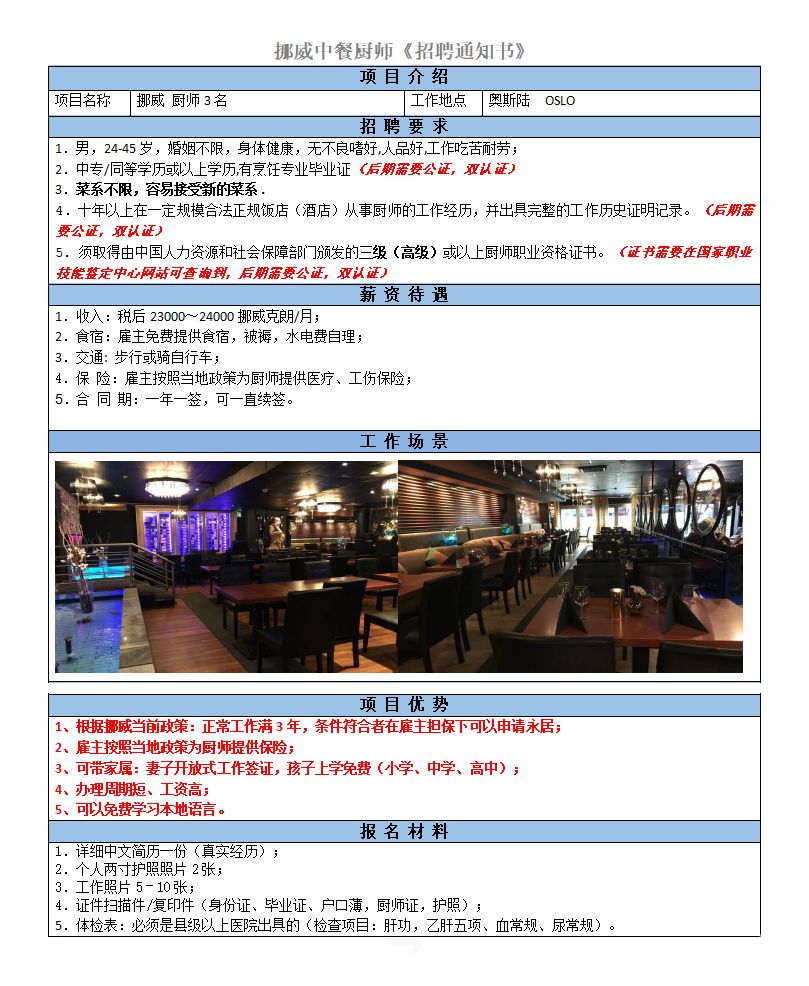 要求47歲以下、男性、高級廚師證、菜系不限,可獨立完成廚房全般工作,如烹飪、備貨、衛生.稅后23000挪威克朗/月以上,有度假金
