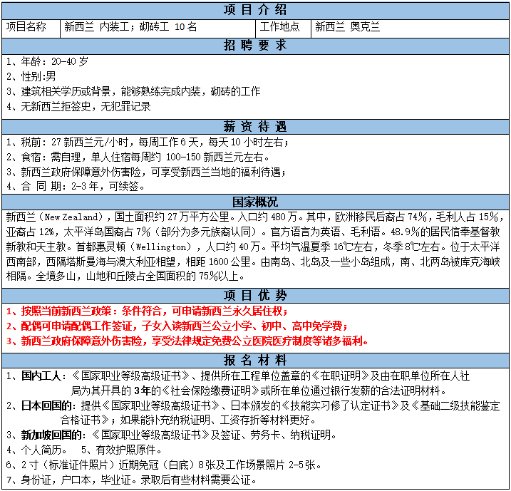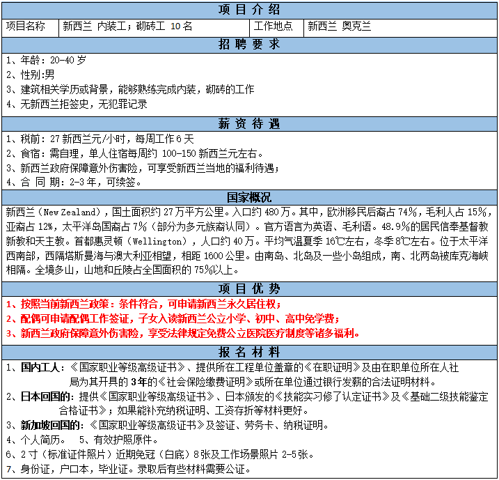 建筑相關(guān)學(xué)歷或背景,能夠熟練完成內(nèi)裝,砌磚的工作;稅前: 27新西蘭元/小時(shí),每周工作6天,每天10小時(shí)左右