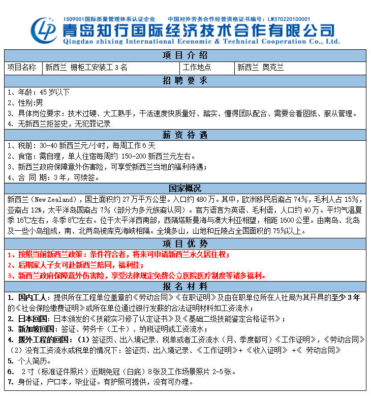 要求45歲以下,男性,會熟練完成噴涂油漆工作,日本回國的優先。稅前27.76新西蘭元/小時。