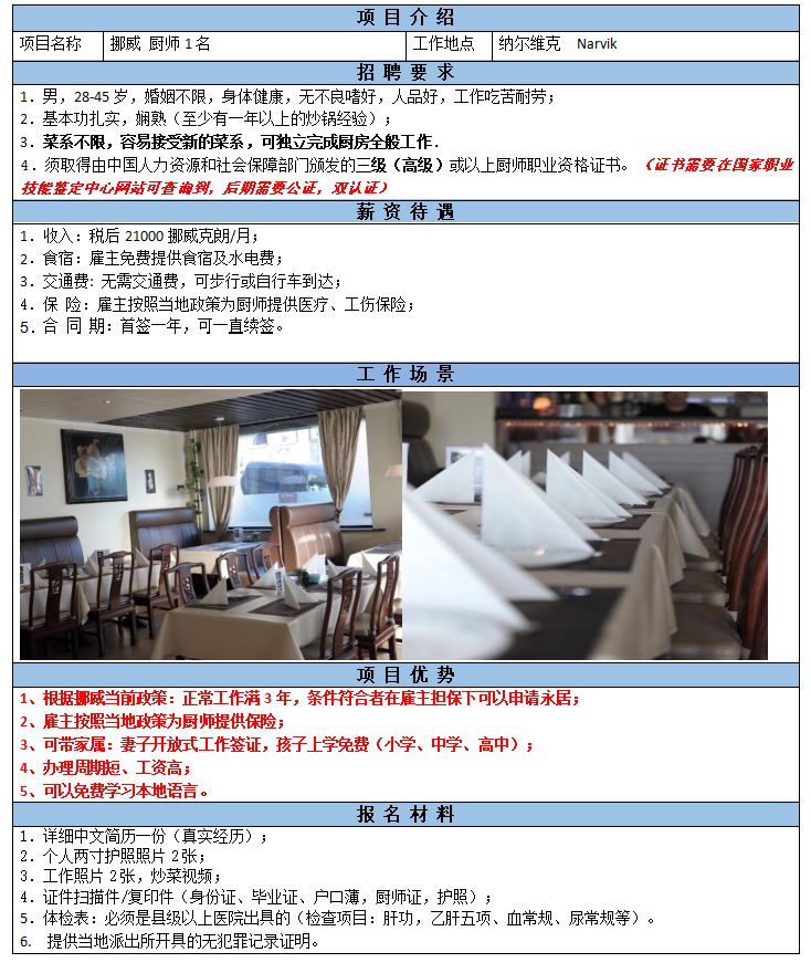 要求47歲以下、男性、高級廚師證、菜系不限,可獨立完成廚房全般工作,如烹飪、備貨、衛(wèi)生.稅后23000挪威克朗/月以上,有度假金