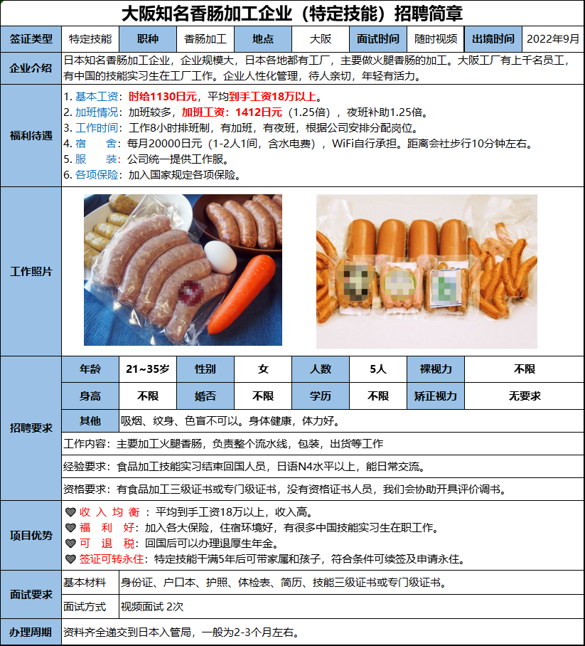 日本知名香腸加工企業,主要做火腿香腸的加工。時給1130日元,平均到手工資18萬以上。