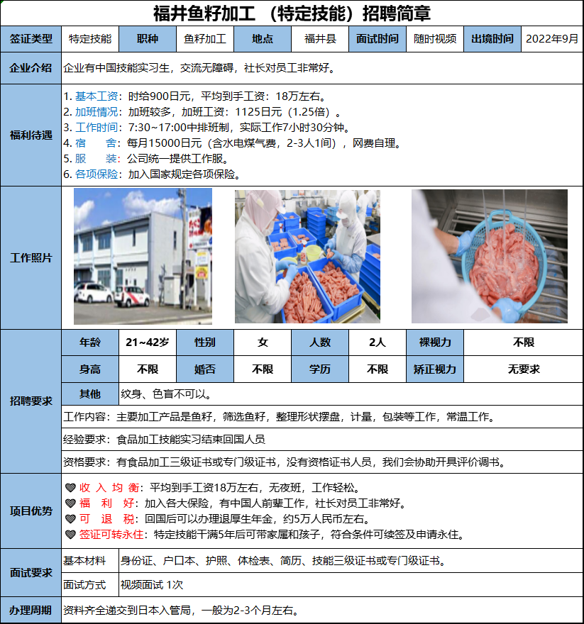 車間常溫工作,女生主要負責稱重,撿魚,擺盤,真空包裝,裝箱為主。男生主要負責刮魚腸,片魚,切魚片,貼標簽,捆包為主。時給1000日元,平均到手工資:20萬日元以上。