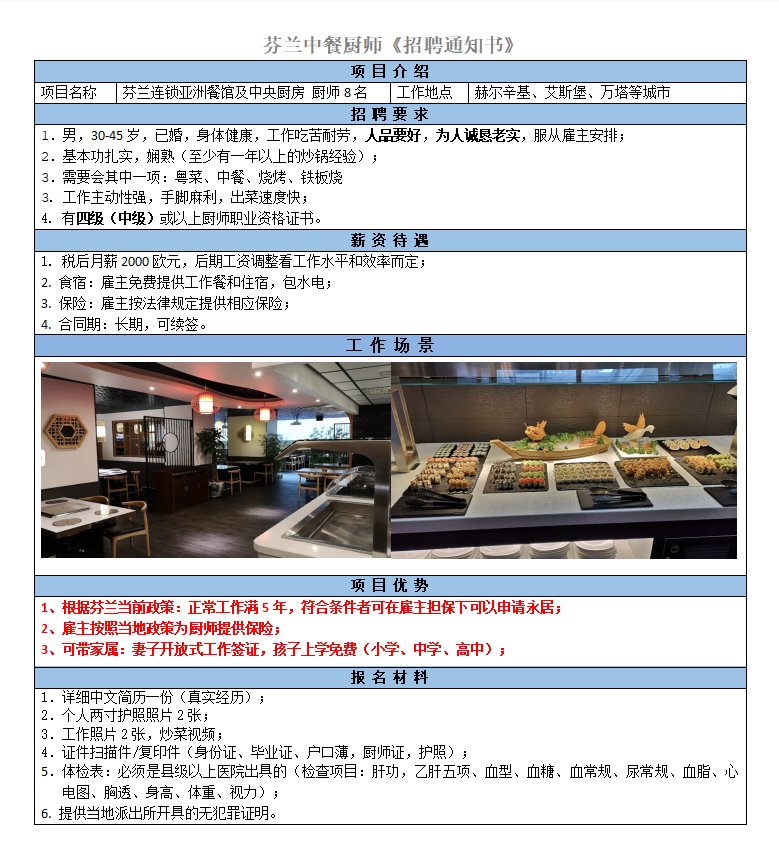 芬蘭高薪項目:包吃住,包水電,住宿地點離餐廳步行十分鐘,月薪2400歐(接近1.7w人民幣)純凈到手收入,要求40歲以下踏實樸實的師傅,不限地域不限菜系。