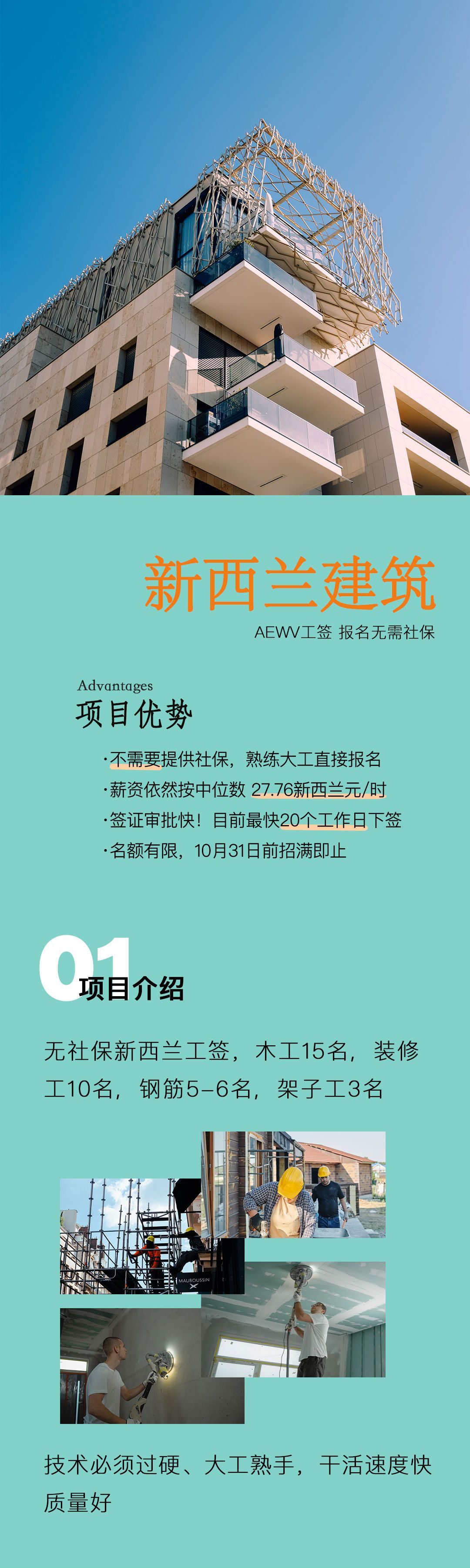 技術過硬、大工熟手,干活速度快質量好、踏實、懂得團隊配合、服從管理。三年以上海外建筑工作經驗,無新西蘭拒簽史,無犯罪記錄,需要培訓語言。
