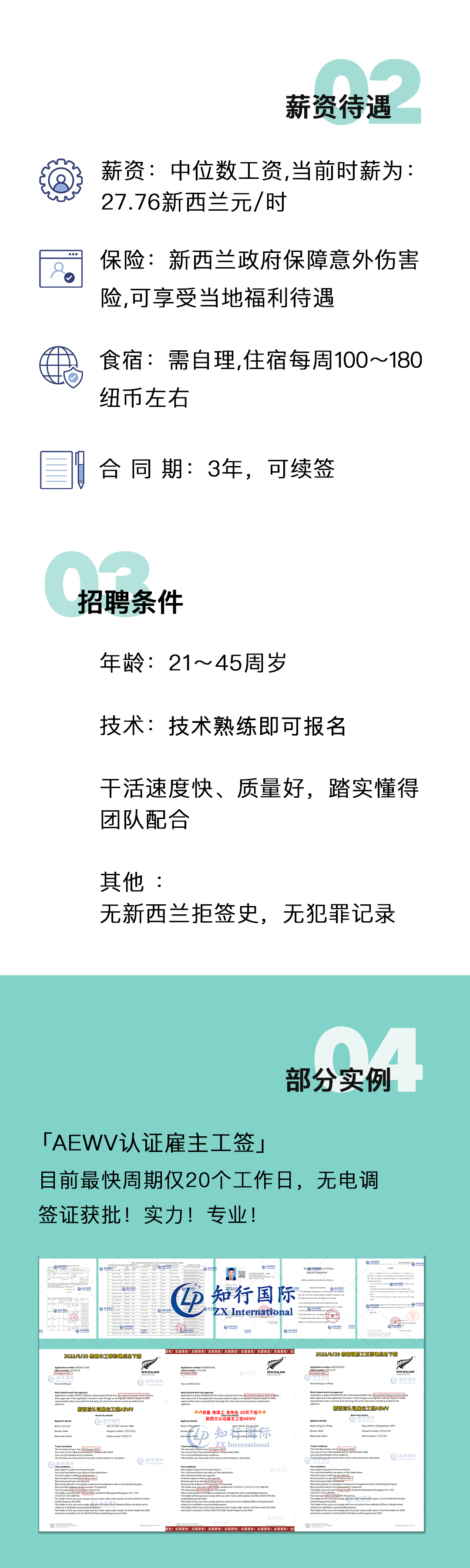 3年以上工作經驗,有日本、新加坡及其它發達國家工作經驗者優先無新西蘭拒簽史,無犯罪記錄