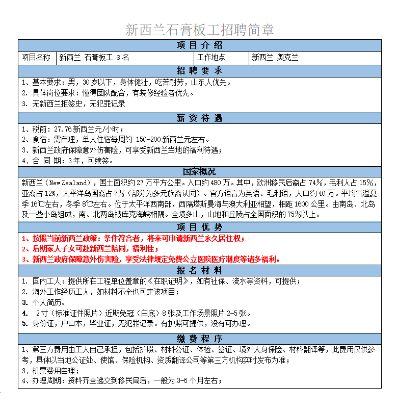 技術(shù)過硬、大工熟手,干活速度快質(zhì)量好、踏實(shí)、懂得團(tuán)隊(duì)配合、服從管理。三年以上海外建筑工作經(jīng)驗(yàn),無新西蘭拒簽史,無犯罪記錄,需要培訓(xùn)語言。