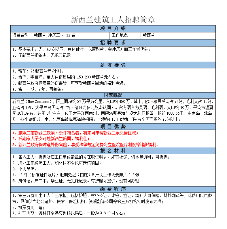 要求:男,40歲以下,身體健壯,吃苦耐勞,會(huì)建筑方面工作者優(yōu)先;稅前25新西蘭元/小時(shí)。