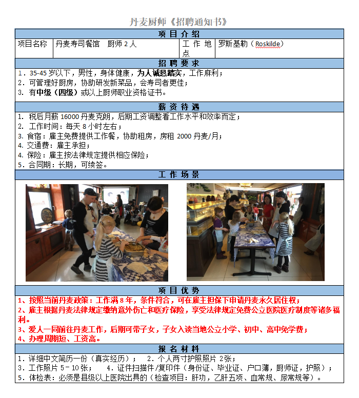 男方主要負責日料制作、女方負責壽司等其他廚房事務,男方會一點英語最佳;稅后22000丹麥克朗/月,后期根據(jù)表現(xiàn)漲薪