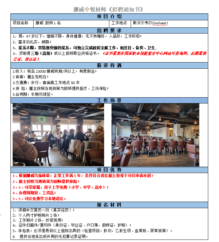 要求47歲以下、男性、高級(jí)廚師證、菜系不限,可獨(dú)立完成廚房全般工作,如烹飪、備貨、衛(wèi)生.稅后23000挪威克朗/月以上,有度假金