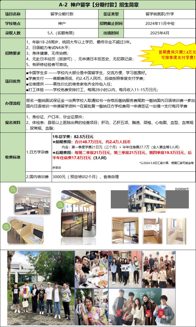 首期費用低,約2.4萬人民幣,后續按照季度支付學費;提供高性價比的宿舍家電齊全拎包入住;學校免費安排打工,每周28小時以內,每月收入11-15萬日元