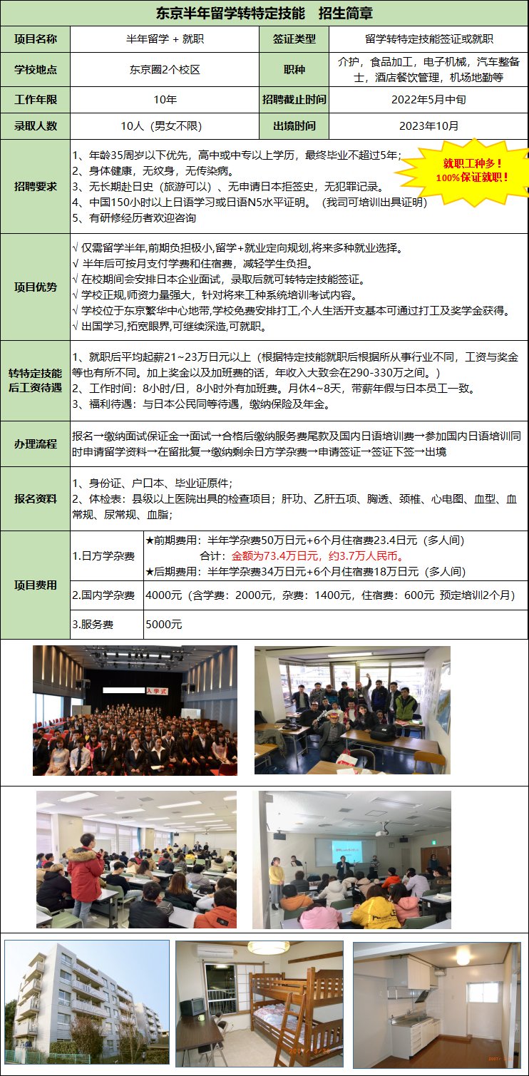 東京半年留學轉特定技能,半年后可就職!就職工種多!100%保證就職!