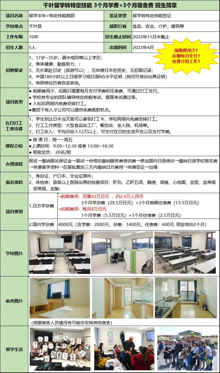 首期費用低,約2.4萬人民幣,后續按照季度支付學費;提供高性價比的宿舍家電齊全拎包入??;學校免費安排打工,每周28小時以內,每月收入11-15萬日元