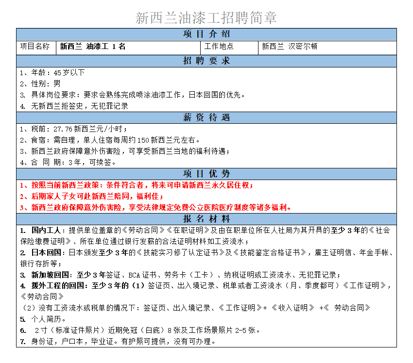 要求45歲以下,男性,會熟練完成噴涂油漆工作,日本回國的優先。稅前27.76新西蘭元/小時。
