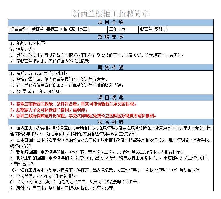 建筑相關學歷或背景,有木工的工作經歷,有多年大型工地建筑經驗,最好會看圖紙反應快,肯吃苦。會英語和有駕照者優先;無新西蘭拒簽史,無犯罪記錄