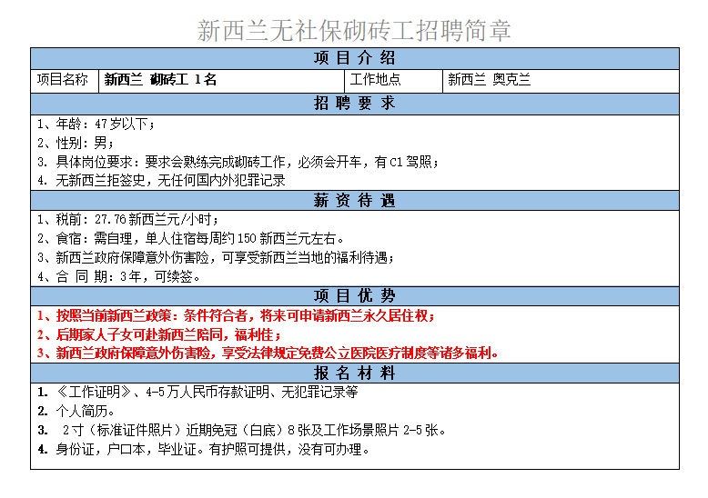 建筑相關學歷或背景,有木工的工作經歷,有多年大型工地建筑經驗,最好會看圖紙反應快,肯吃苦。會英語和有駕照者優先;無新西蘭拒簽史,無犯罪記錄