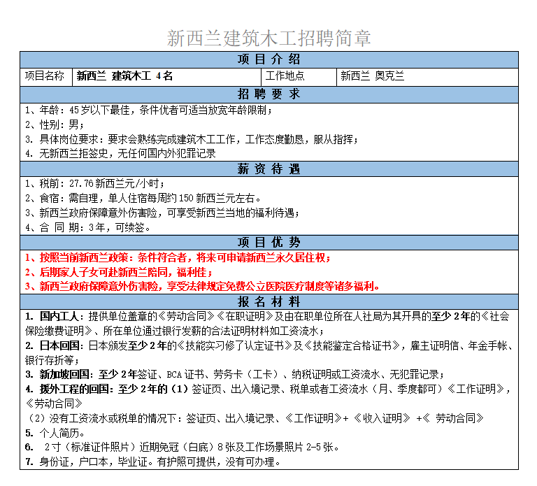 建筑相關學歷或背景,有木工的工作經歷,有多年大型工地建筑經驗,最好會看圖紙反應快,肯吃苦。會英語和有駕照者優先;無新西蘭拒簽史,無犯罪記錄