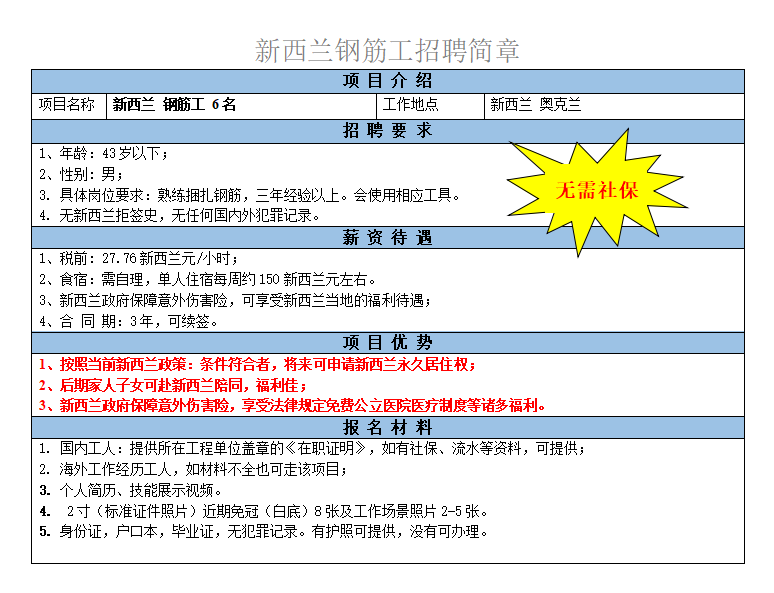 技術(shù)過硬、大工熟手,干活速度快質(zhì)量好、踏實(shí)、懂得團(tuán)隊(duì)配合、服從管理。三年以上海外建筑工作經(jīng)驗(yàn),無新西蘭拒簽史,無犯罪記錄,需要培訓(xùn)語言。