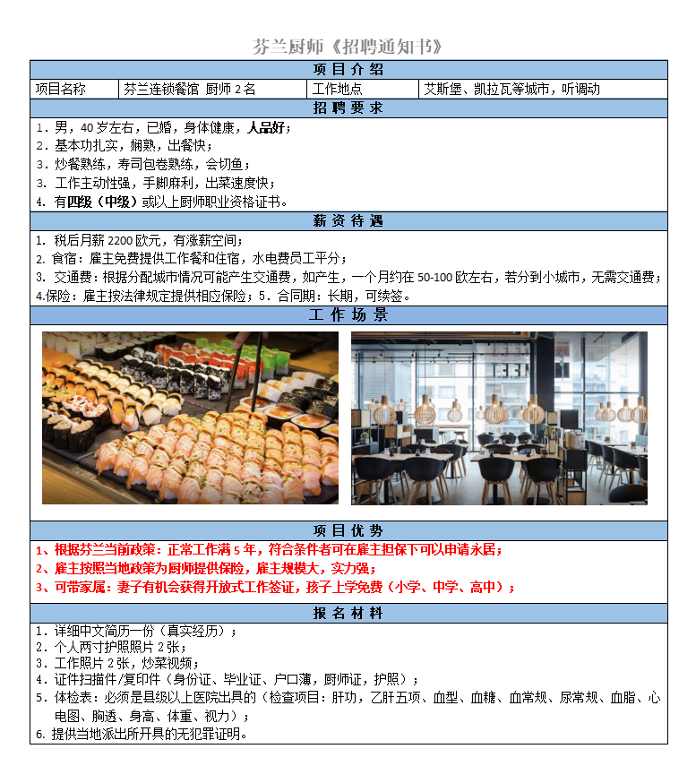芬蘭高薪項目:包吃住,包水電,住宿地點離餐廳步行十分鐘,月薪2400歐(接近1.7w人民幣)純凈到手收入,要求40歲以下踏實樸實的師傅,不限地域不限菜系。