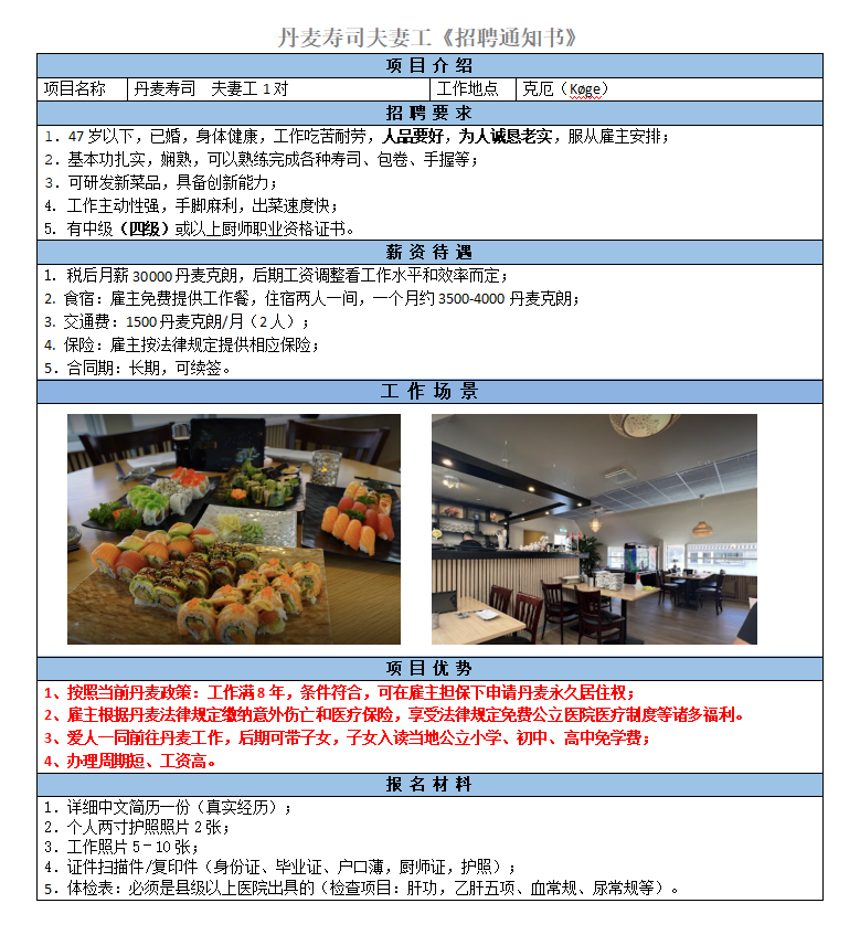 男方主要負(fù)責(zé)日料制作、女方負(fù)責(zé)壽司等其他廚房事務(wù),男方會(huì)一點(diǎn)英語(yǔ)最佳;稅后22000丹麥克朗/月,后期根據(jù)表現(xiàn)漲薪