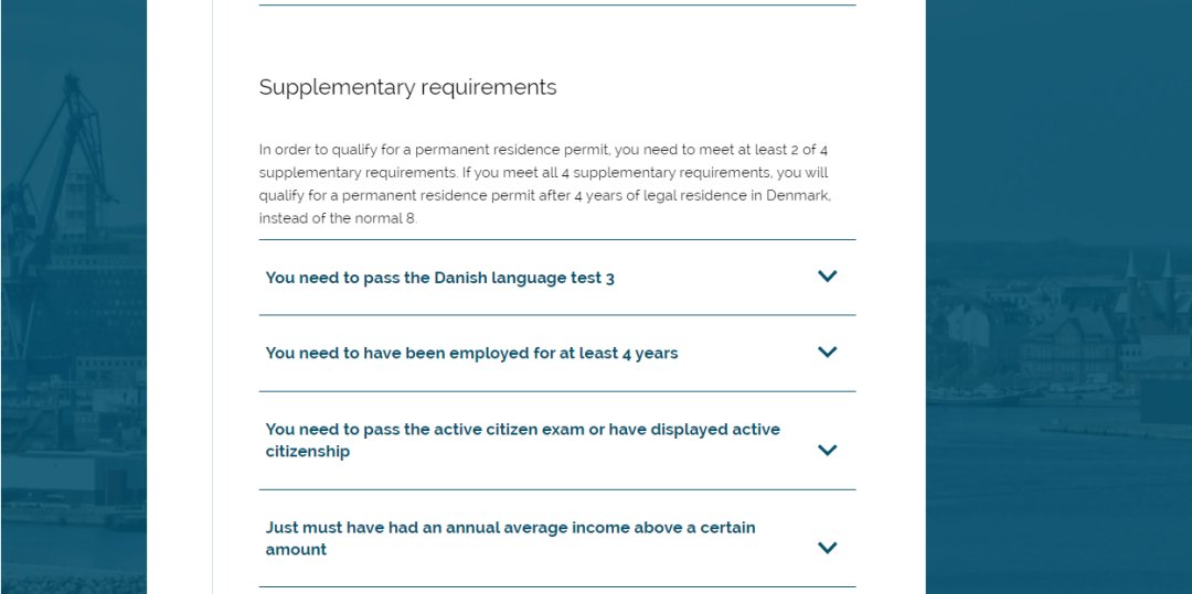 在滿足基本要求的情況下,滿足全部補(bǔ)充要求,即有資格在丹麥合法居留4年后獲得永久居留許可。