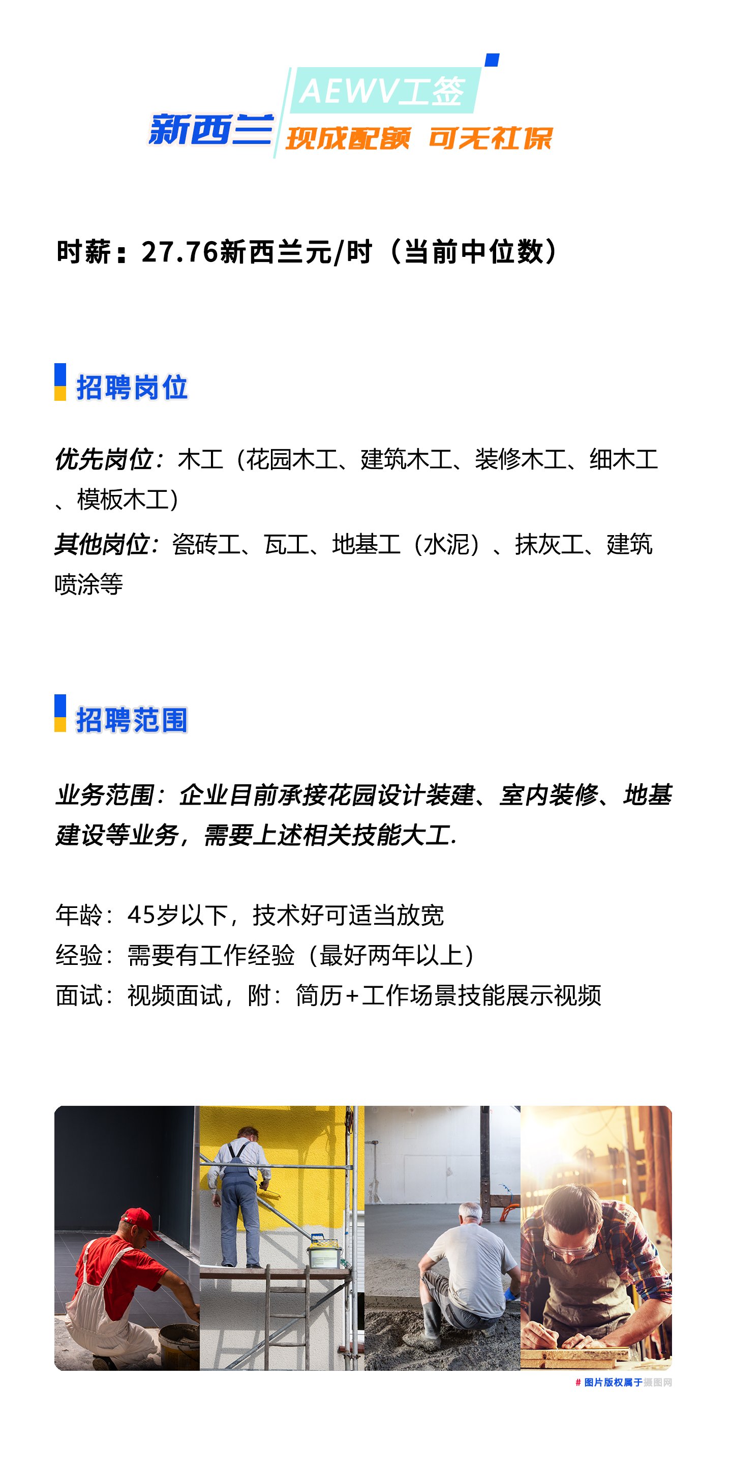 要求會(huì)熟練完成建筑木工工作,工作態(tài)度勤懇,服從指揮,稅前27.76新西蘭元/小時(shí)