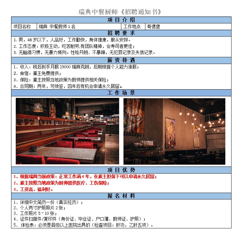 中餐廚師;菜系不限,熟練切配、炒鍋;取得中級廚師證或中級廚師證以上;起薪稅后20000瑞典克朗,后期視工作能力漲薪