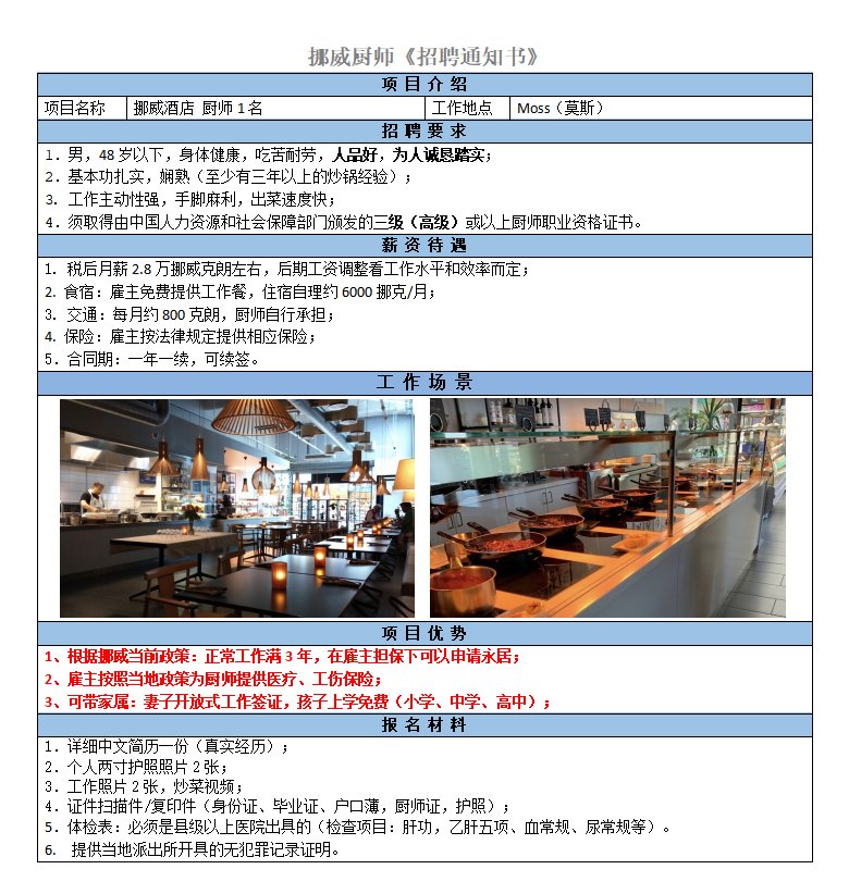 要求47歲以下、男性、高級(jí)廚師證、菜系不限,可獨(dú)立完成廚房全般工作,如烹飪、備貨、衛(wèi)生.稅后23000挪威克朗/月以上,有度假金
