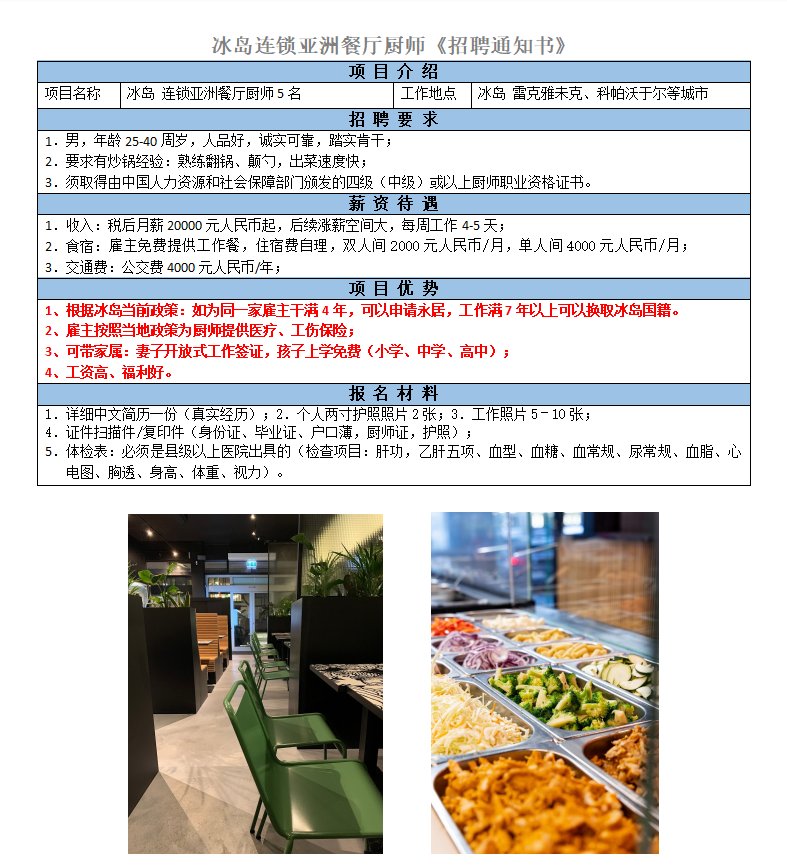 年齡43歲以內(nèi),3年以上炒鍋經(jīng)驗(yàn);無地域要求;每天工作8小時(shí),管吃管住26萬冰島克朗。