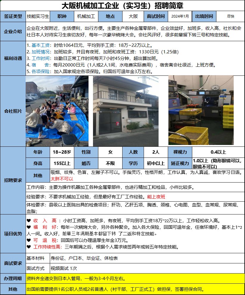 具體工作主要在物流會社做物品分揀,要求身體健壯。