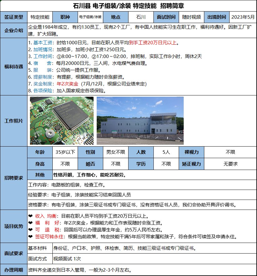 主要負責電路板的組裝,檢查工作;要求電子組裝,涂裝技能實習結束回國人員;平均到手工資20萬日元以上。