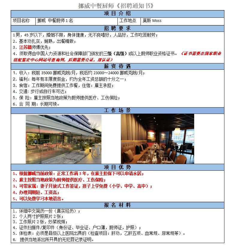 要求47歲以下、男性、高級廚師證、菜系不限,可獨立完成廚房全般工作,如烹飪、備貨、衛生.稅后23000挪威克朗/月以上,有度假金