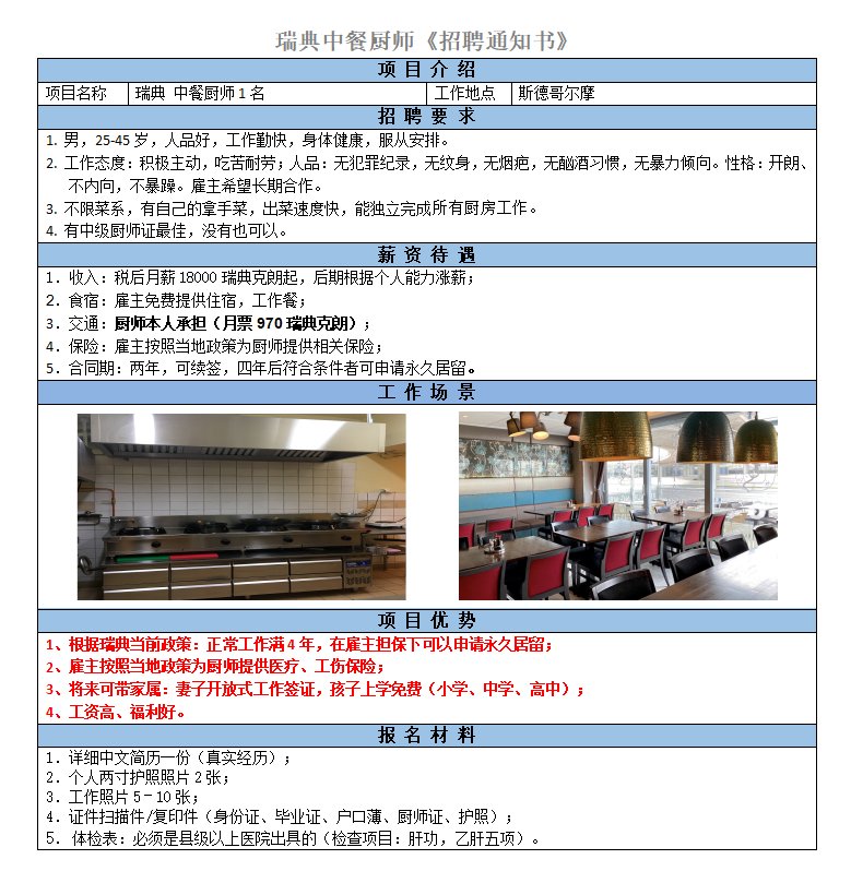 中餐廚師;菜系不限,熟練切配、炒鍋;取得中級廚師證或中級廚師證以上;起薪稅后20000瑞典克朗,后期視工作能力漲薪