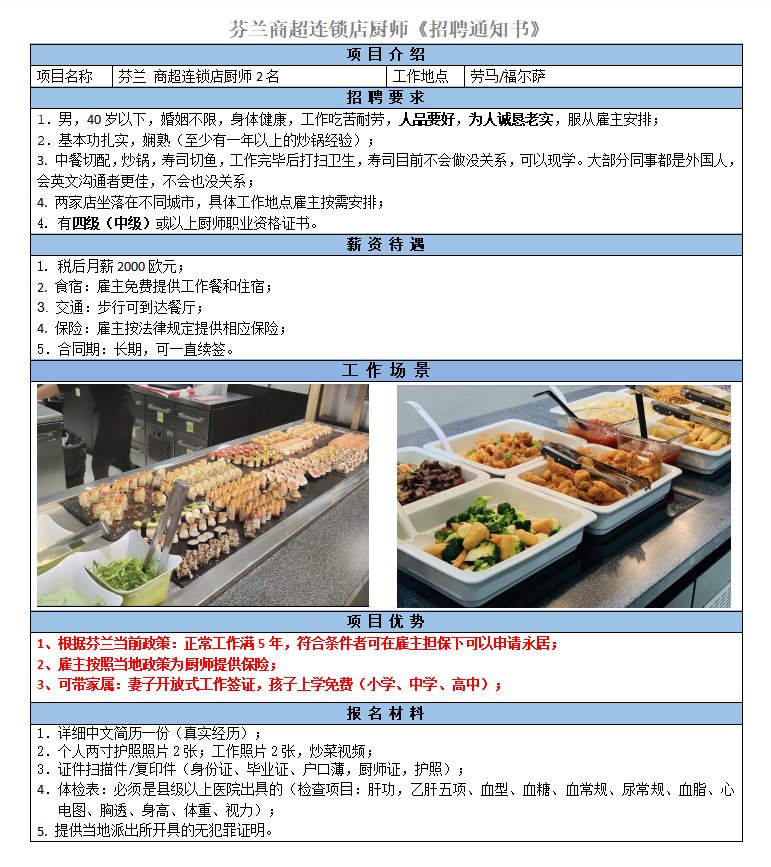 芬蘭高薪項(xiàng)目:包吃住,包水電,住宿地點(diǎn)離餐廳步行十分鐘,月薪2400歐(接近1.7w人民幣)純凈到手收入,要求40歲以下踏實(shí)樸實(shí)的師傅,不限地域不限菜系。