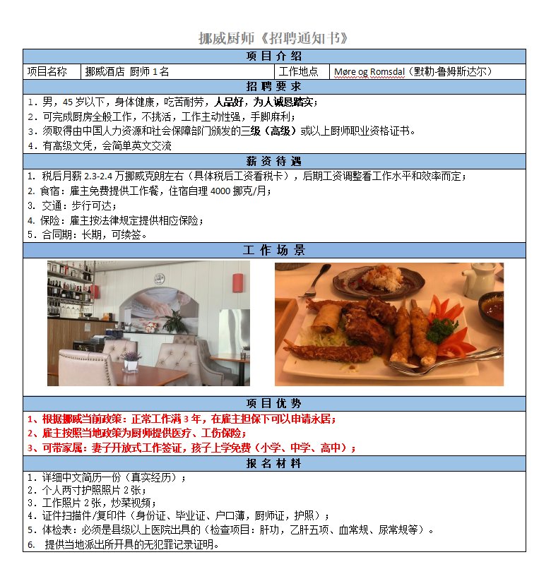 要求47歲以下、男性、高級廚師證、菜系不限,可獨立完成廚房全般工作,如烹飪、備貨、衛生.稅后23000挪威克朗/月以上,有度假金