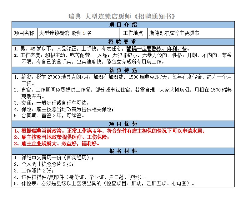 中餐廚師;菜系不限,熟練切配、炒鍋;取得中級(jí)廚師證或中級(jí)廚師證以上;起薪稅后20000瑞典克朗,后期視工作能力漲薪