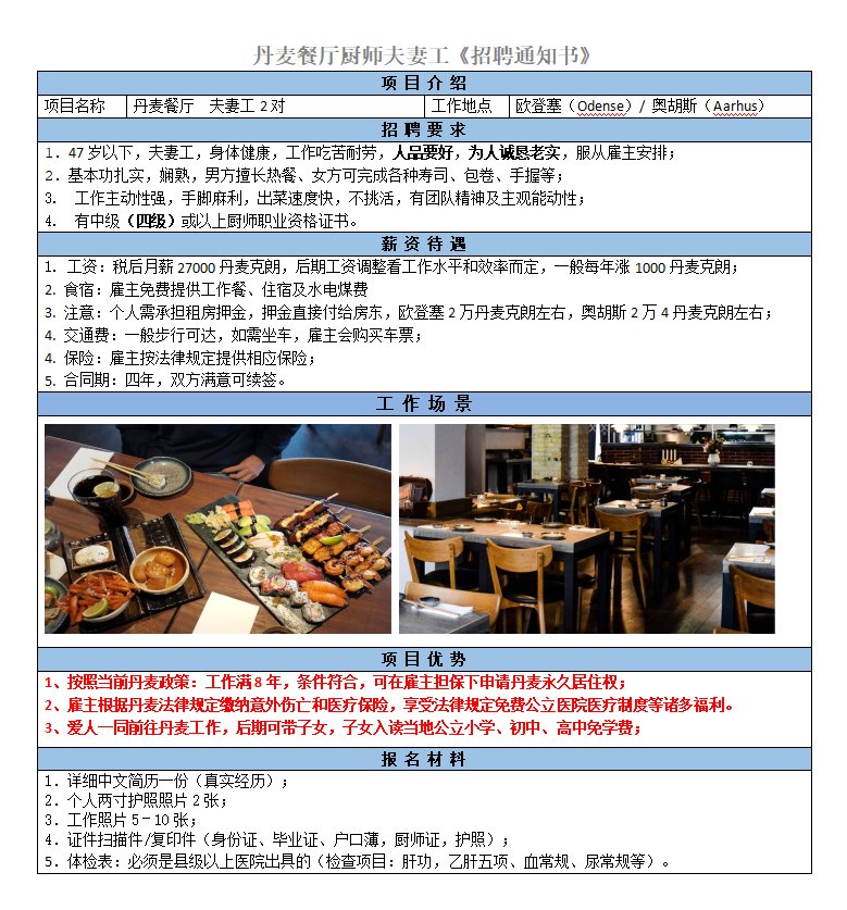 丹麥超高薪夫妻項目來咯!28000丹麥克朗包吃住,餐廳規模大,值得信賴。目前需要兩對夫妻,若單人申請也可考慮。