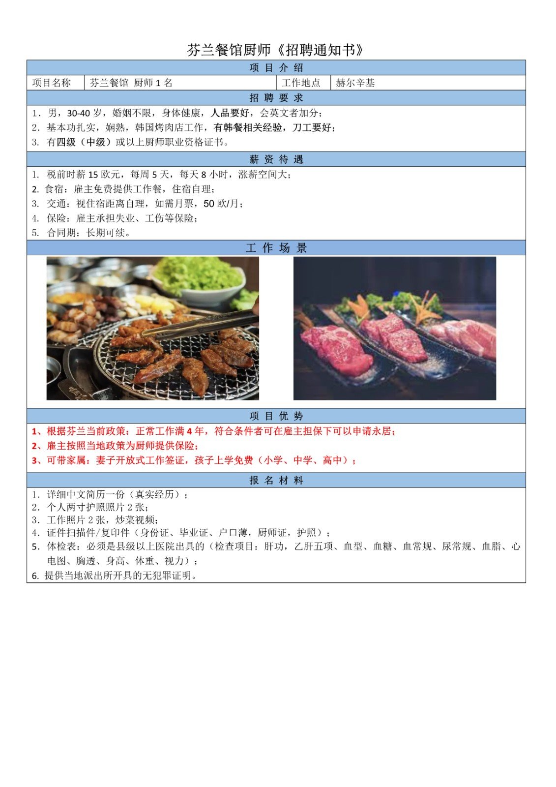 芬蘭高薪項(xiàng)目:包吃住,包水電,住宿地點(diǎn)離餐廳步行十分鐘,月薪2400歐(接近1.7w人民幣)純凈到手收入,要求40歲以下踏實(shí)樸實(shí)的師傅,不限地域不限菜系。