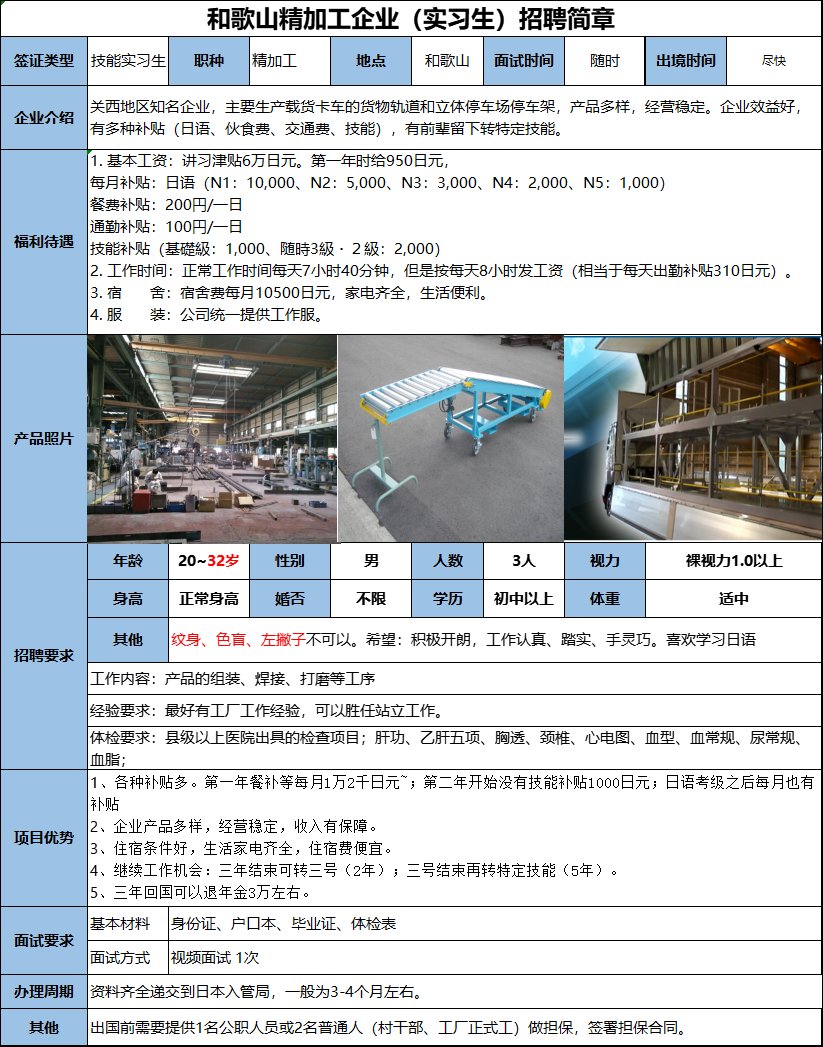 具體工作主要在物流會社做物品分揀,要求身體健壯。