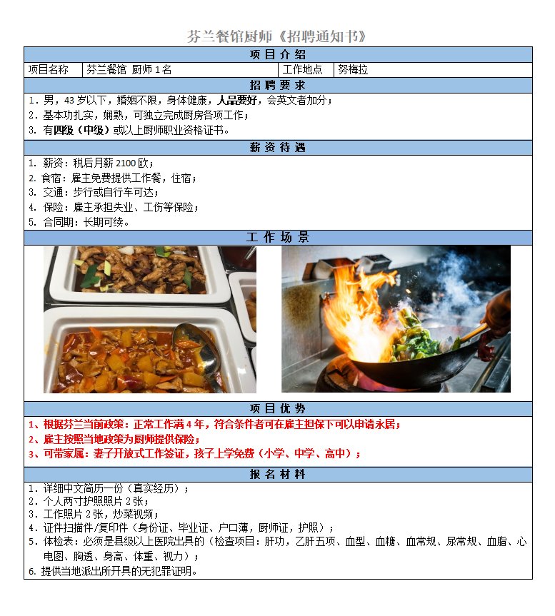 芬蘭高薪項目:包吃住,包水電,住宿地點離餐廳步行十分鐘,月薪2400歐(接近1.7w人民幣)純凈到手收入,要求40歲以下踏實樸實的師傅,不限地域不限菜系。
