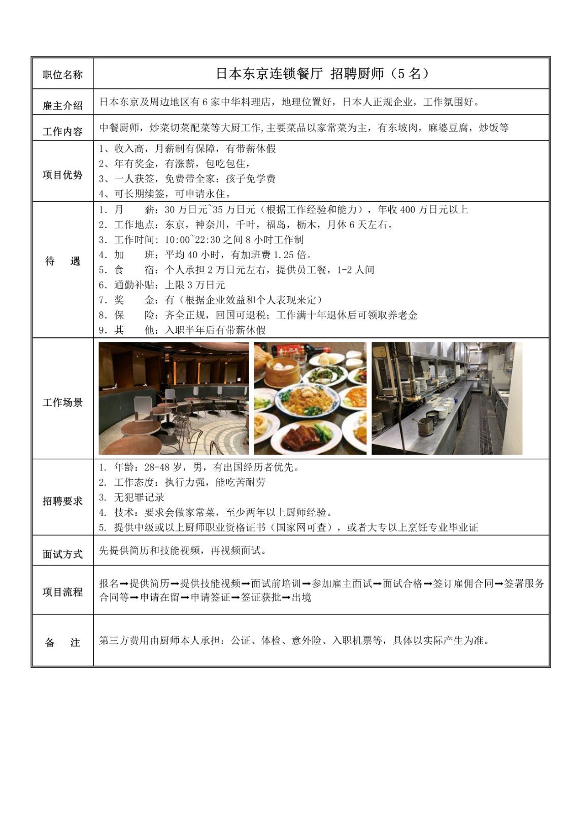 主要從事烹飪中華料理的全般工作。 性質站立工作,需要有耐力,患有頸椎、腰疼等關節病,慢性病的不可以。貧血,頭暈,癲癇,色盲不可以。