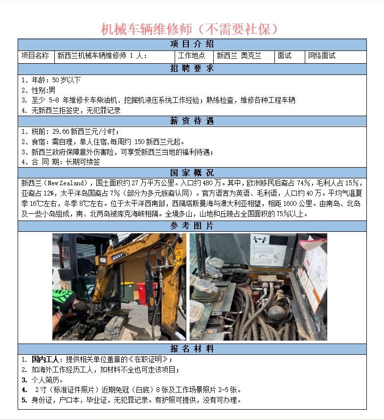 要求能熟練完成挖掘機(jī)工作,適應(yīng)各種地形。稅前27.76新西蘭元/小時(shí)