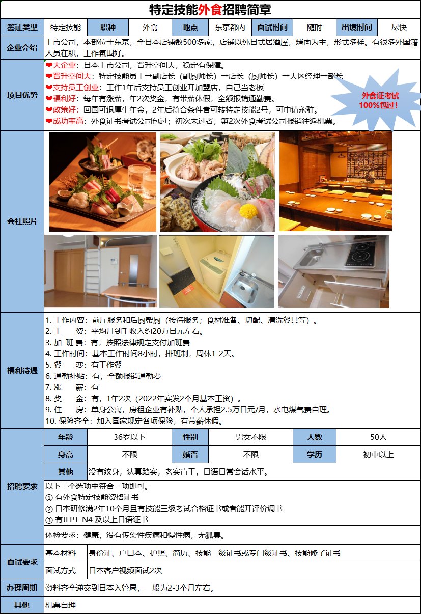 主要負責前廳服務和后廚幫廚(煮面,洗菜、配菜、清洗餐具)。免費提供工作餐,有獎金,有漲薪機會。回國后可退厚生年金。符合條件者干滿2年后可轉特定技能2號,可帶家屬,可申請永住。
